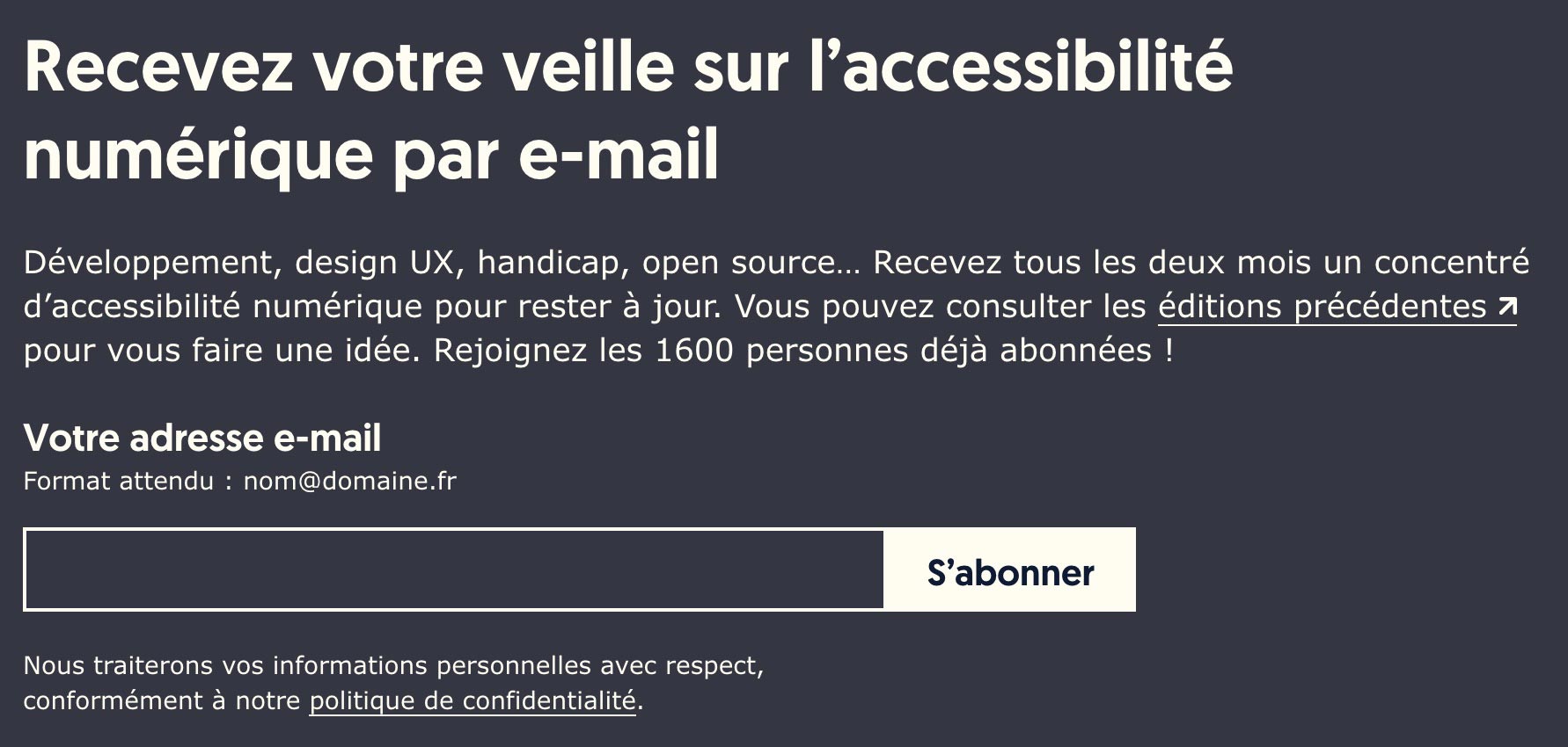 Toutefois, pour l’accessibilité, il est essentiel que ce bloc dispose d’un titre : c’est ce qui va permettre aux personnes handicapées utilisant une technologie d’assistance de se repérer dans la page et d’y naviguer plus facilement.